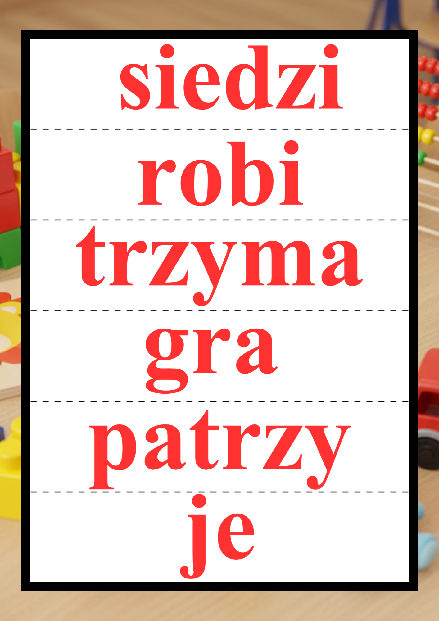 W pakiecie znajduje się 180 kart do nauki czytania globalnego PDF, zawierających 90 wyrazów bliskich dziecku. Każdy wyraz występuje w dwóch wersjach kolorystycznych – czerwonej i czarnej czcionce, co odpowiada klasycznemu etapowi nauki czytania globalnego i ułatwia stopniowe przejście do standardowego zapisu tekstu.