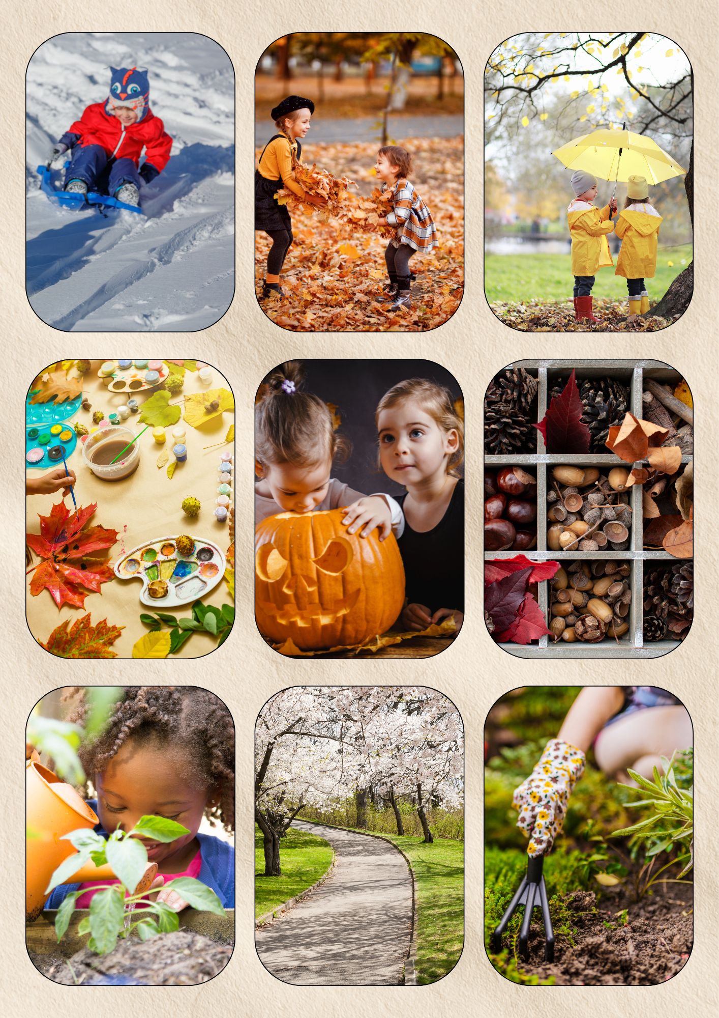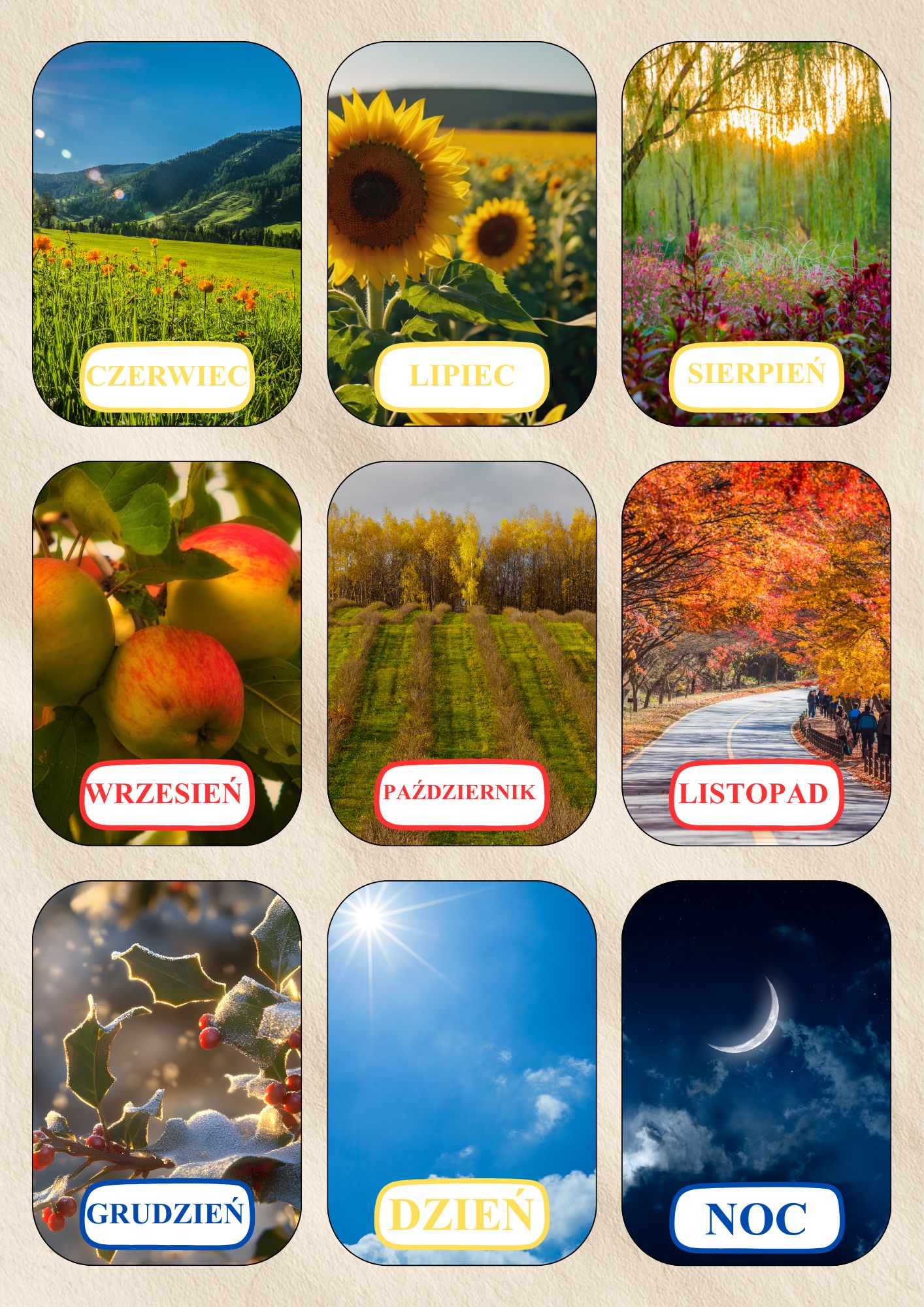 Edukacyjne karty pory roku, miesiące do druku (PDF) to zestaw realistycznych kart edukacyjnych, które pomagają dzieciom zrozumieć miesiące roku, pory roku oraz pojęcia dnia i nocy. Materiał został zaprojektowany w minimalistycznym, naturalnym stylu Montessori, wspierającym koncentrację, samodzielność i naukę poprzez obserwację.