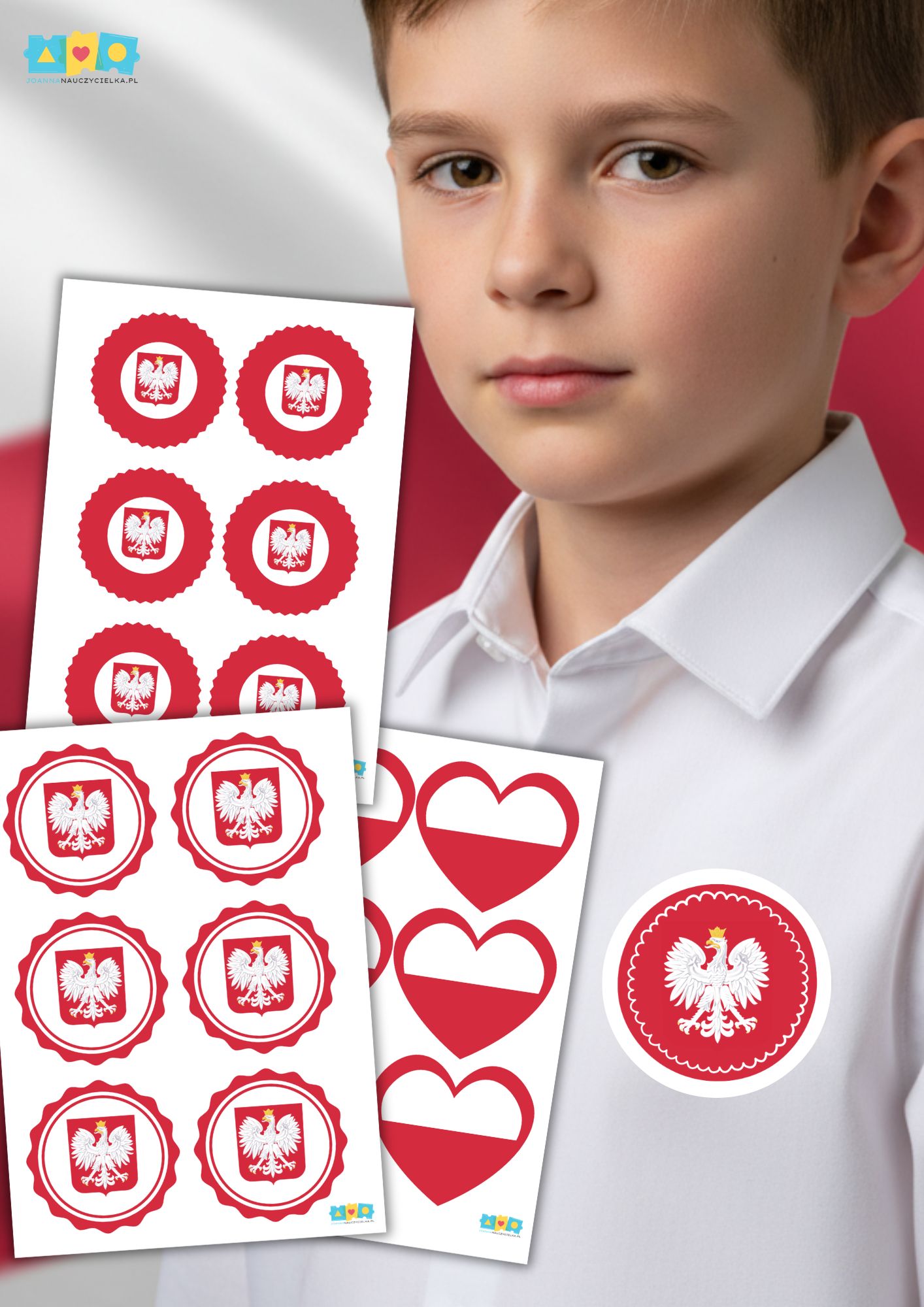 W pakiecie znajdziesz aż 10 różnych wzorów kotylionów biało-czerwonych, które możesz szybko wydrukować i przygotować razem z dziećmi.