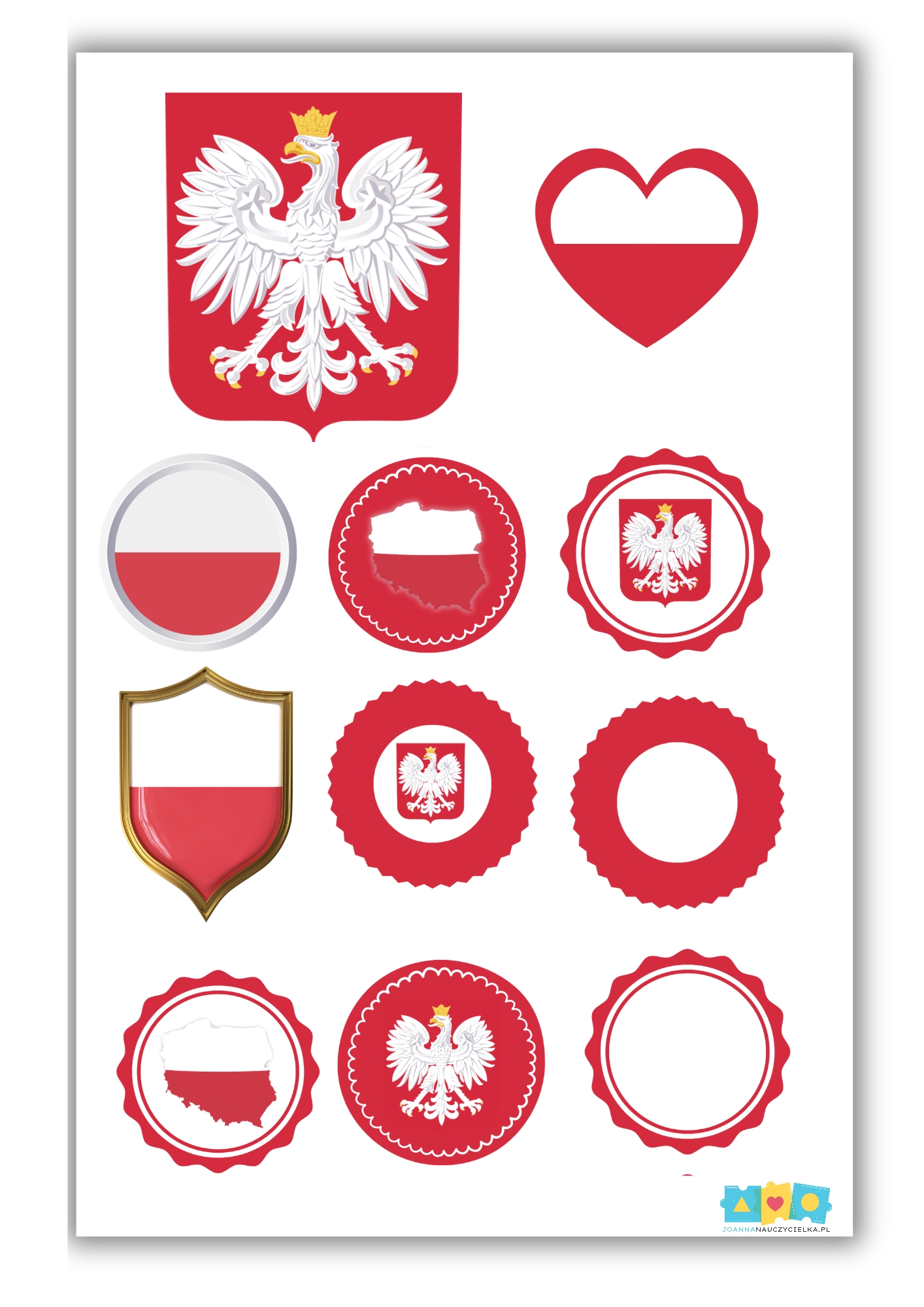 • motywy: flaga Polski, godło Polski do druku, mapa Polski itp.,