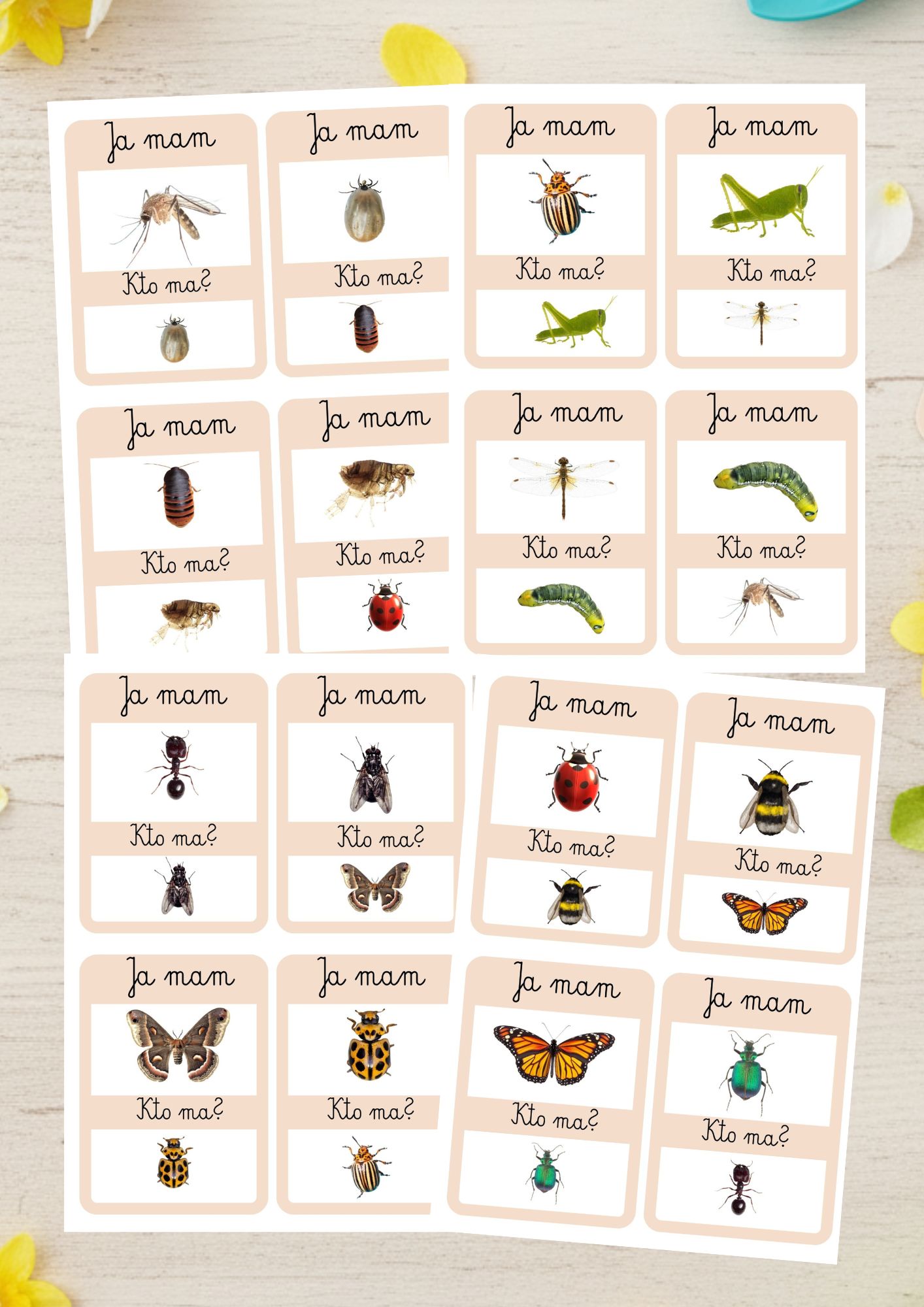 - Karty z owadami i podpisami