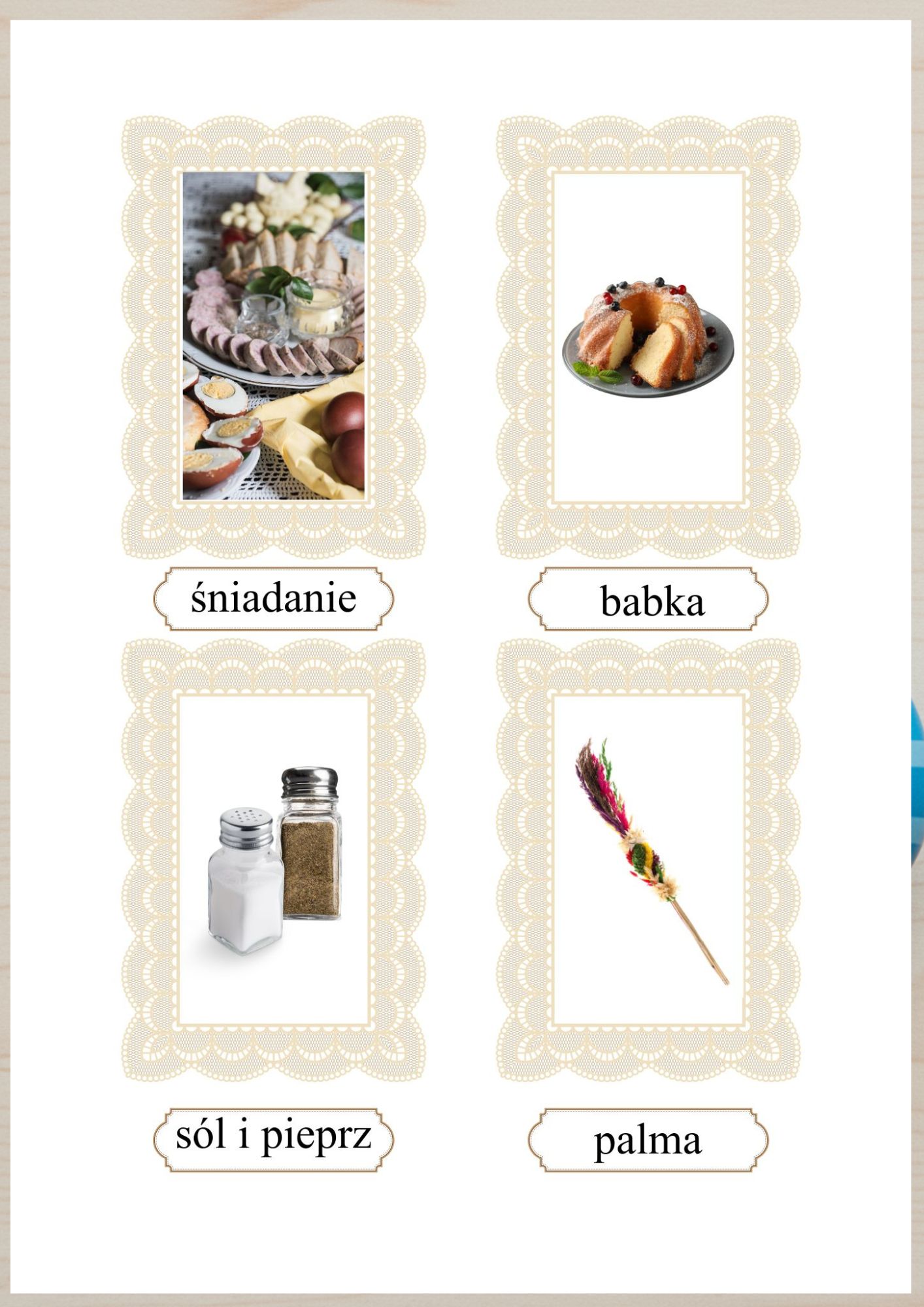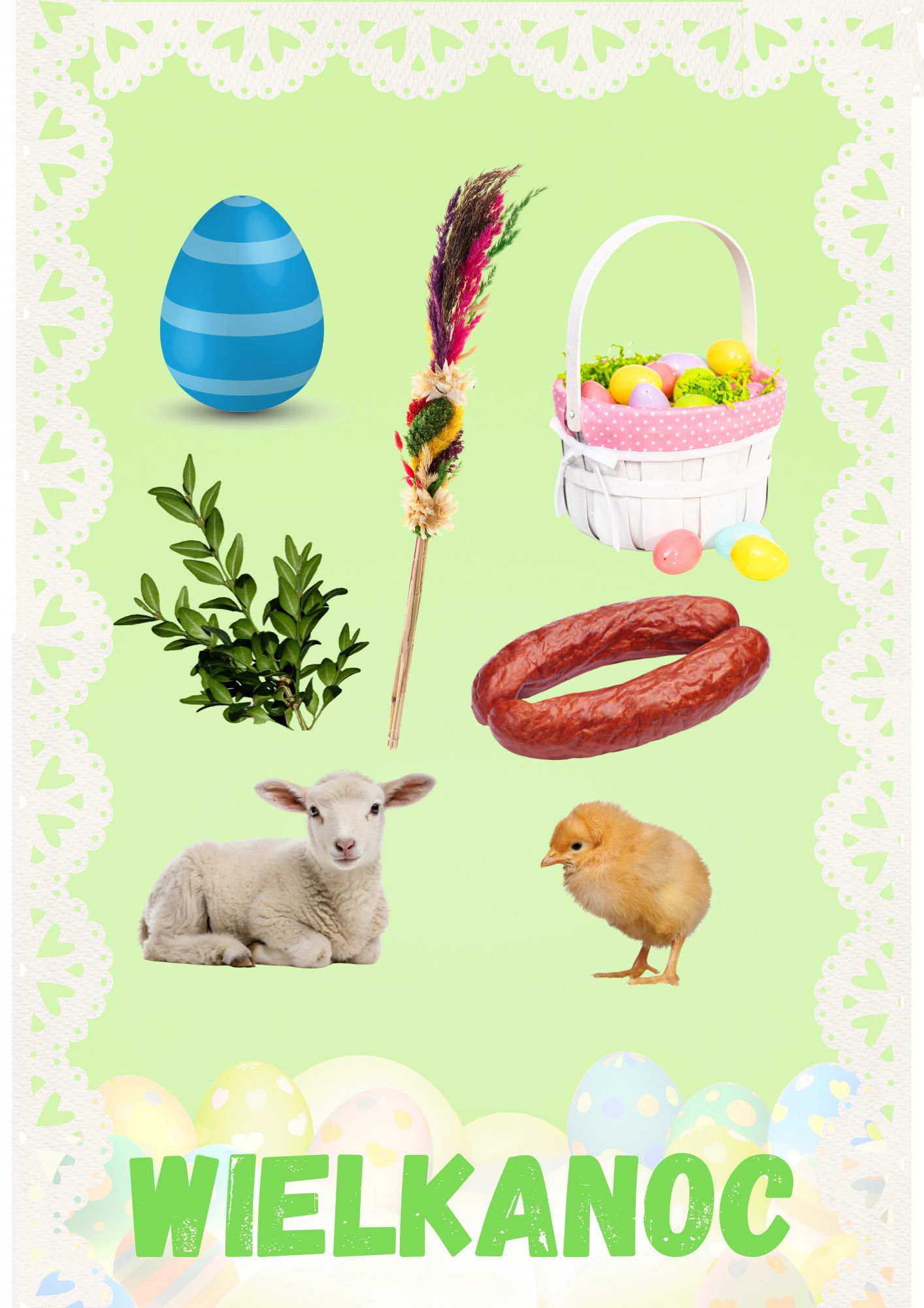 - 12 symboli wielkanocnych (np. pisanki, śniadanie wielkanocne, babka, palma, sól i pieprz, koszyczek wielkanocny i inne)